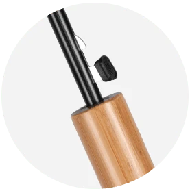 Parasol ma bambusową rączkę, która pięknie kontrastuje z czernią, dodając całości i uroku i charakteru.
